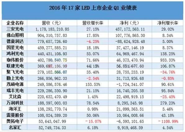 LED产值首都出现衰退,LED后面行情究竟如何呢?为此笔者统计了17家上市LED企业2016年第一季度报告的营收数据,以观当前LED行业所处的现状。