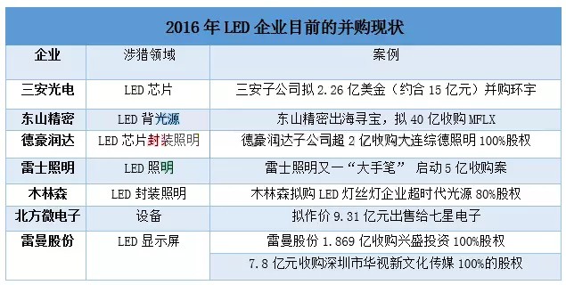 到了2016年第一季度,并购装扮业绩的现象依然延续。据统计,截止4月26日,目前LED行业2016年设计并购金额近100亿,其中芯片代表三安光电拟近15亿收购环宇;封装代表木林森购LED灯丝灯企业超时代光源80%股权,金额不详;显示屏代表雷曼光电7.8亿元收购深圳市华视新文化传媒;照明代表雷士照明启动5亿收购案等等。