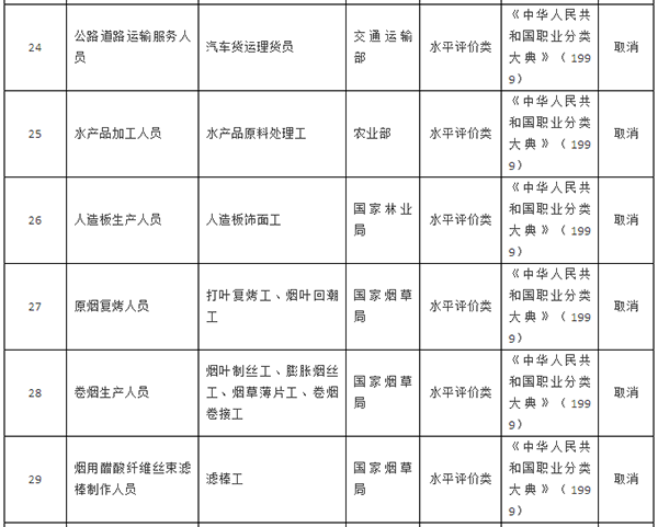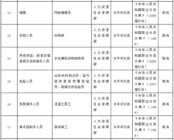 本次取消的职业资格许可和认定事项中,专业技术人员职业资格9项,其中准入类8项,水平评价类1项,涉及招标、物业管理、价格鉴证等多个专业领域;技能人员职业资格38项,均为水平评价类,涉及林业、道路运输、卷烟、机械制造、纺织、化工等领域。