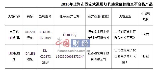 中国网财经8月16日讯 据上海质量技术监督局官网近日消息,近期,上海市质量技术监督局对本市生产和销售的固定式通用灯具产品质量进行了监督抽查。本次抽查了25批次产品,经检验,不合格2批次。