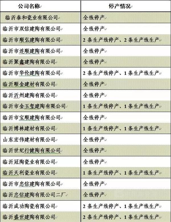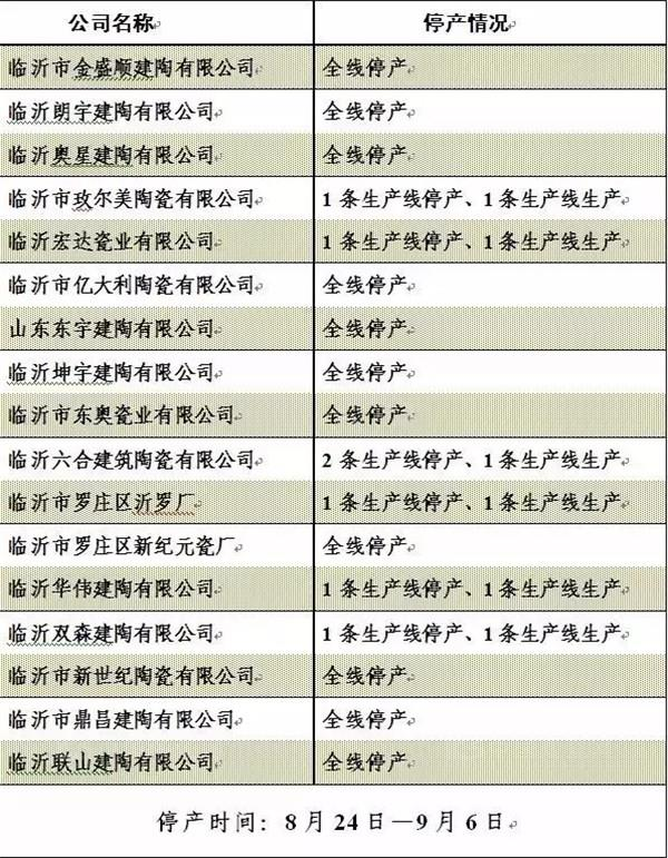 8月24日起 临沂62条陶瓷生产线停产14天