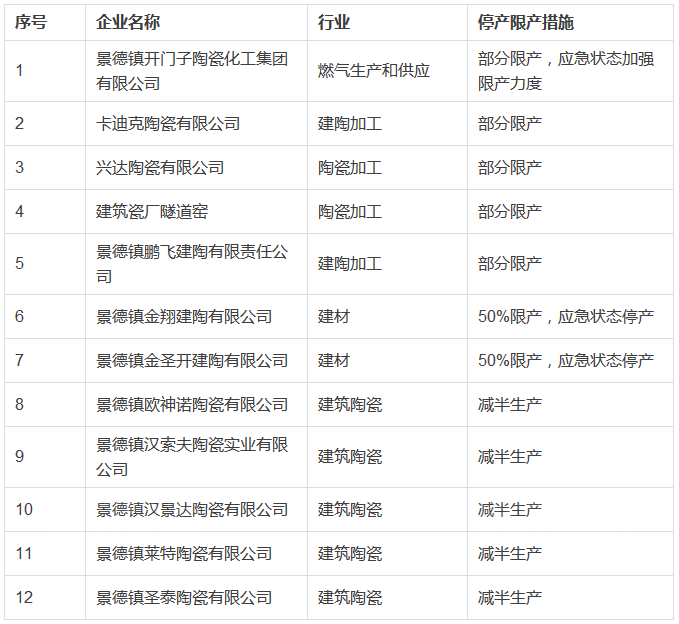 景德镇市G20峰会环境空气质量区域协作保障方案的保障时间为2016年8月23日至9月7日,其公布的行动期间停、限产企业名单,具体如下: