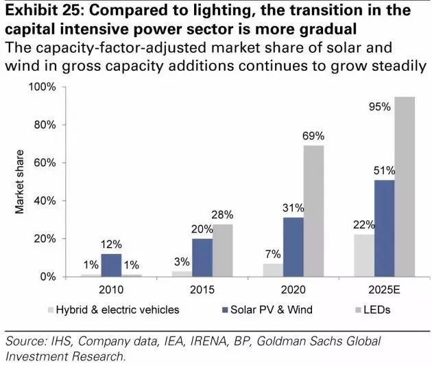 它称LED为人类史上最快的技术转移之一。风能和太阳能挑战传统的发电部门,而LED已占领了照明行业。到2020年LED将占销量的69%,2025年将达100%,而LED的兴起则源于2010年,速度之快令人震惊。