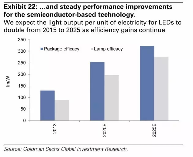高盛公司估计,在未来的十年,每单位电力的照明输出将增加一倍,这将使LED在可再生能源,离网型应用方面越来越具吸引力。