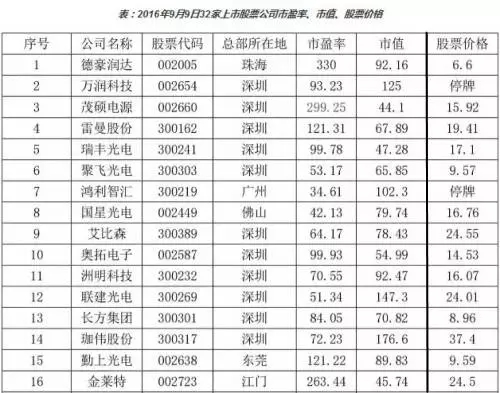 表:2016年9月9日32家上市股票公司市盈率、市值、股票价格