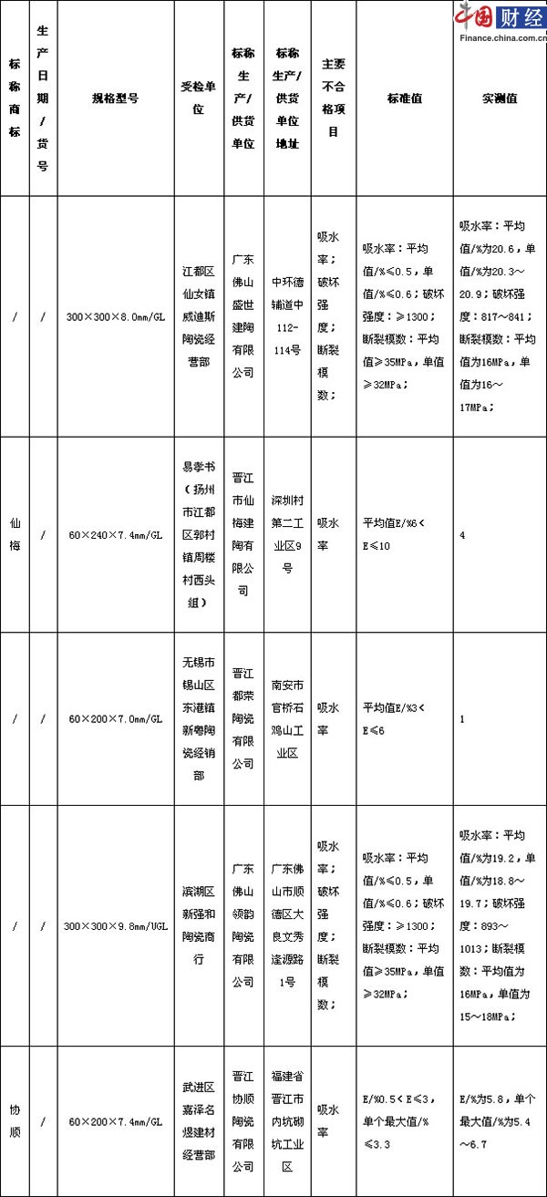 江苏省工商局抽检陶瓷墙地砖产品 5批次质量不合格