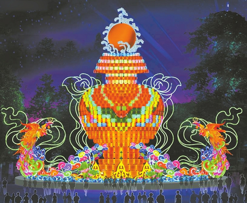 据本次灯会的设计方自贡灯彩集团相关负责人介绍,在灯组设计上,还融入了荣县本土的元素,将利用荣县特有的土陶制品为原材料,在创新和改良后,通过独有工艺,打造一座长25米、高18米的“吉祥宝瓶”。该灯组将采用10000个土陶罐和10000个土陶莲花瓣、10000个LED灯进行创意融合,打造出流光溢彩、美轮美奂的艺术效果。这也是自贡彩灯首次采用土陶为原材料,将申请吉尼斯世界纪录。