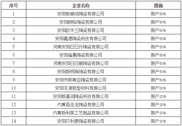 在强制性污染减排措施中表示,除保障群众基本生活和确保生产安全之外,涉及大气污染物排放企业应当停止生产。其中,陶瓷企业中,内黄陶瓷产业园的10家陶瓷厂被限产50%,4家被限产20%。另外,已经改造为天然气、电(不含熔炼电炉、中频炉)、醇基燃料的清洁能源企业,限产50%。