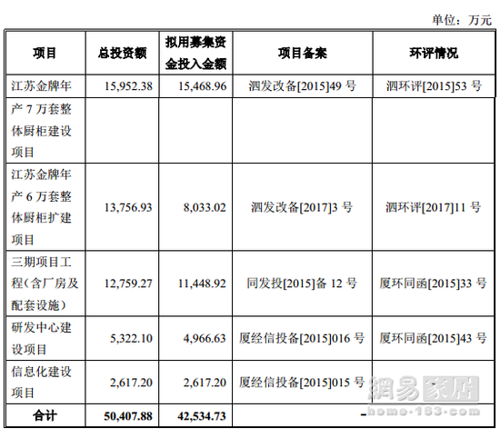 招股说明书显示,金牌厨柜本次拟向社会公众公开发行不超过1,700万股人民币普通股(A股),募集资金拟用于“江苏金牌年产7万套整体厨柜建设项目”、“江苏金牌年产6万套整体厨柜扩建项目”、“三期项目工程(含厂房及配套设施)”、 “研发中心建设项目”、“信息化建设项目”等五个项目。