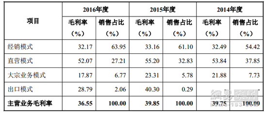 招股书资料显示,金牌厨柜主营业务共有经销、直营、大宗业务以及出口四类销售模式,其中,经销和直营为主要模式,2016年销售占比分别为63.95%、27.21%。从三年营收数据来看,金牌厨柜主营业务毛利率为36.55%,经销模式销售占比连年增长。