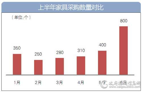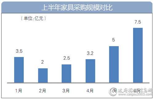 6月,家具采购市场无论是项目数量还是采购规模都有了爆发式的增长。实际完成的家具采购项目约800个,采购规模近7.5亿元,环比增长2.5亿元,增长幅度近50%。