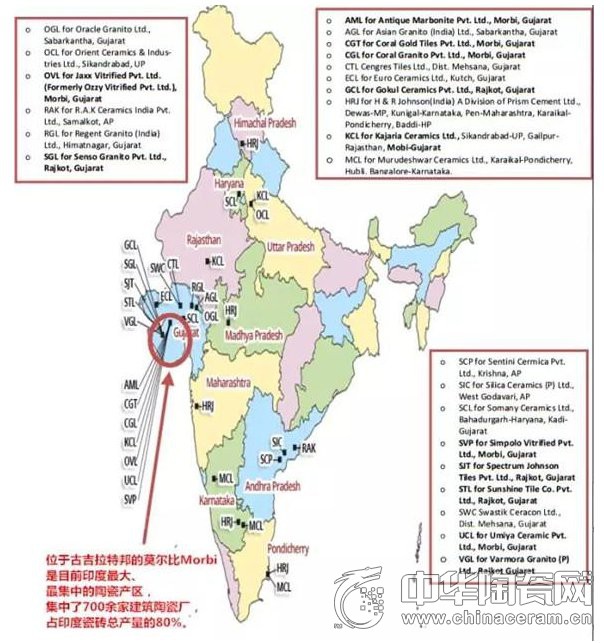 位于古吉拉特邦的莫尔比Morbi是目前印度最大、最集中的陶瓷产区,集中了700余家建筑陶瓷厂,占印度瓷砖总产量的80%。