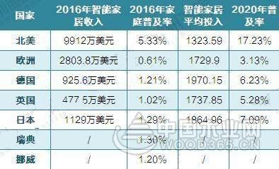 数据显示,欧洲2016年在智能家居市场上的收入达到2803.8万美元,在家庭的普及率为0.61%,预计在2020将达到3.13%;北美地区2016年在智能家居市场上的收入达到9912万美元,在家庭的普及率为5.33%,预计在2020将达到17.23%。