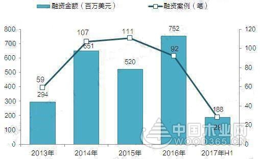 图表3:2013-2017年智能家居行业融资情况(单位:百万美元,笔)