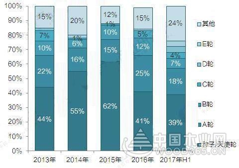 图表4:2013-2017年智能家居行业融资轮次占比(单位:%)