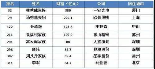照明行业中,排在首位的依然是三安光电林秀成家族(林秀成、林志强父子),同时也是福建首富和厦门首富,其财富值从去年的196.6亿元猛增至380亿元,排名从69大升至32位。截止今天10月底,三安光电总市值已突破千亿元大关,位居A股半导体照明行业上市公司市值榜首。