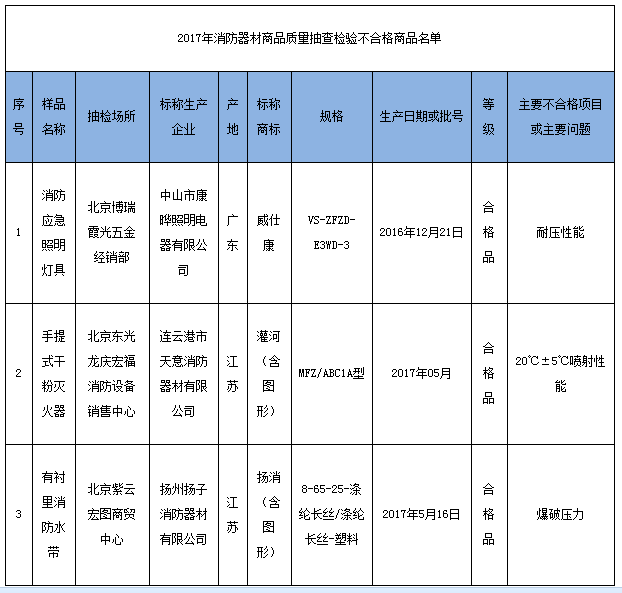 其中,标称中山市康晔照明电器有限公司生产的标称商标为“威仕康”的1批次消防应急照明灯具(规格:VS-ZFZD-E3WD-3;生产日期或批号:2016年12月21日)样品被检出耐压性能项目不合格;标称连云港市天意消防器材有限公司生产的标称商标为“灌河(含图形)”的1批次手提式干粉灭火器(规格:MFZ/ABC1A型;生产日期或批号:2017年05月)样品被检出20℃±5℃喷射性能项目不合格;标称扬州扬子消防器材有限公司生产的标称商标为“扬消(含图形)”的1批次有衬里消防水带(规格:8-65-25-涤纶长丝/涤纶长丝-塑料;生产日期或批号:2017年5月16日)样品被检出爆破压力项目不合格。