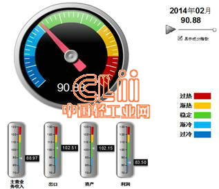 其中:主营业务收入指数88.97,出口景气指数102.51,资产景气指数102.15,利润景气指数83.50。与2013年12月相比,指数均有所有回落。主营业务收入、利润指数处于渐冷区间,其中主营业务收入指数为近年来首次跌入渐冷区间,参见图2。