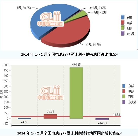 2014年1~2月,全国电池行业完成累计利润总额同比增长14.81%。其中,东部完成累计利润总额占50.25%,同比增长-4.99%;中部完成累计利润总额占44.76%,同比增长36.83%;西部完成累计利润总额占4.35%,同比增长474.35%;东北部完成累计利润总额占0.63%,同比增长-14.53%。