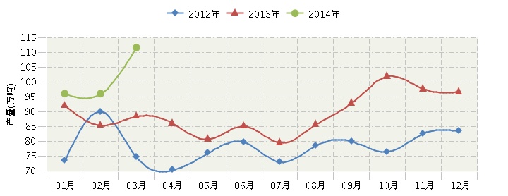 根据国家统计局公布数据,2014年1月~3月,全国合成洗涤剂行业累计完成产量267.68万吨,同比增长16.97%。其中:3月份完成产量111.63万吨,同比增长20.61%。