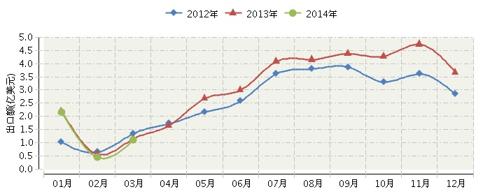 2014年全国毛皮及其制品行业连续三年月度出口额对比