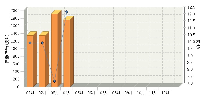 根据国家统计局公布数据, 2014年1~4月,全国铅酸蓄电池行业累计完成产量6,604.45万千伏安时,同比增长8.16%。其中:4月份完成产量1756.68万千伏安时,同比增长12.42%。2014年全国铅酸蓄电池行业月度产量及同比如下图所示。