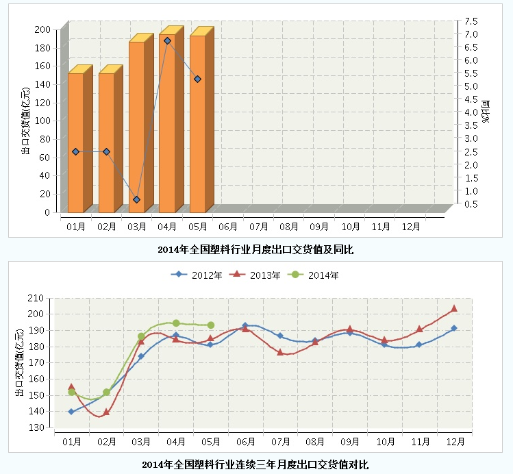 2014年1月~5月,全国塑料制品行业累计完成出口交货值880.81亿元,同比增长3.66%。其中:5月份完成出口交货值193.32亿元,同比增长5.6%,比4月份回落1.47个百分点。