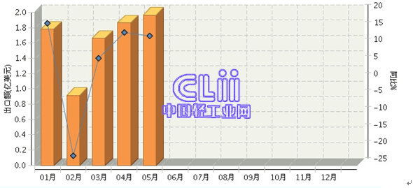 2014年1月~5月,全国缝纫机及零件行业累计完成出口额8.17亿美元,同比增长7.09%。其中:1月份完成出口额1.78亿美元,同比增长16.73%;2月份完成出口额0.92亿美元,同比增长-22.12%;3月份完成出口额1.66亿美元,同比增长6.43%;4月份完成出口额1.86亿美元,同比增长14.03%;5月份完成出口额1.96亿美元,同比增长13.13%。