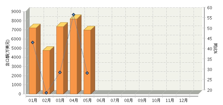 根据海关总署发布数据,2014年1月~5月,全国香精香料行业累计完成出口额34,469.47万美元,同比增长37.50%。其中:1月份完成出口额7209.89万美元,同比增长45.03%;2月份完成出口额4750.46万美元,同比增长20.52%;3月份完成出口额7352.41万美元,同比增长30.45%;4月份完成出口额8192.61万美元,同比增长58.48%;5月份完成出口额6963.66万美元,同比增30.14%。2014年全国化妆品行业月度出口额及同比增长趋势如下图所示。