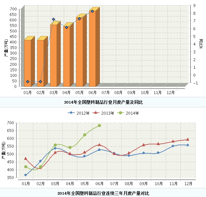 2014年1月~6月,全国塑料制品行业累计完成产量3471.85万吨,同比增长6.38%。其中:6月份完成产量682.96万吨,同比增长8.74%。塑制品产量月度增速已连续3个月回升。