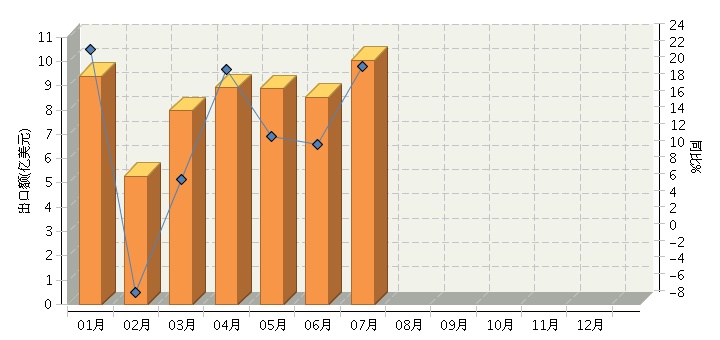 根据海关总署公布数据, 2014年1~7月,全国电池行业累计完成出口额同比增长13.24%。其中: 7月份完成出口额同比增长20.47%。2014年全国电池行业月度出口额及同比如下图所示。