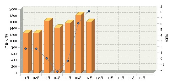 据国家统计局数据显示,2014年1月~7月,全国规模以上企业累计生产卫生陶瓷制品行业11091.19万件,同比增长7.47%。其中:7月份完成产量1609.91万件,同比增长8.74%。2014年全国卫生陶瓷制品月度产量及同比如下图所示。