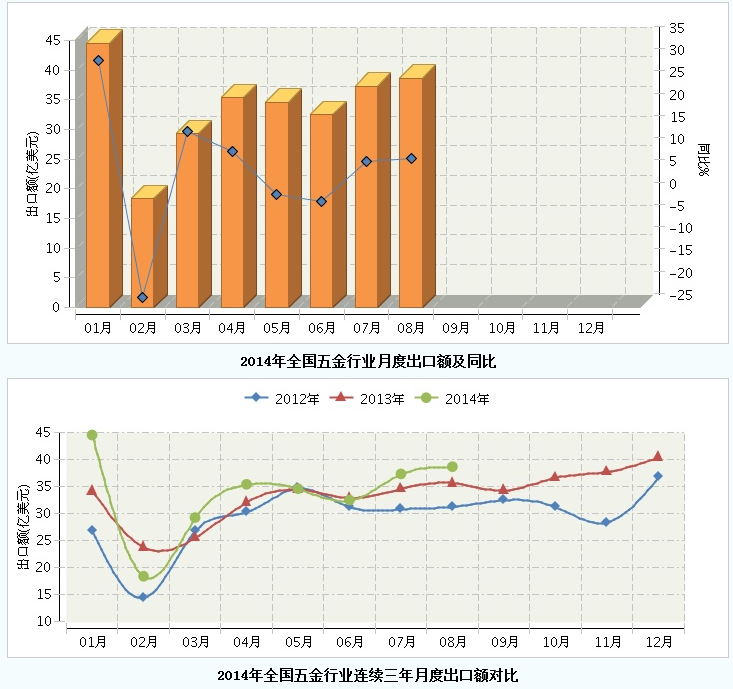 2014年1月~8月,全国五金行业累计完成出口额270.35亿美元,同比增长6.81%。8月份完成出口额38.64亿美元,同比增长8.41%,出口额和同比值均高于7月份。
