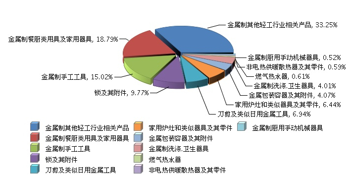 8月,金属制餐厨类用具及家用器具、金属制手工工具两个子行业完成出口额占比相对较多,均超过10%以上。其中,金属制餐厨类用具及家用器具完成出口额7.26亿美元,同比增长17.21%;金属制手工工具完成出口额5.8亿美元,同比增长20.13%。各子行业中,刀剪及类似日用金属工具完成出口额同比增长最高,为28%。