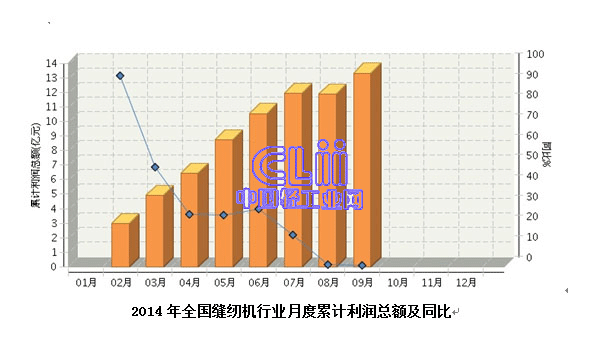 2014年1月~9月,全国缝纫机行业累计完成利润总额13.32亿元,同比增长0.74%。其中:1月~2月份完成累计利润总额2.96亿元,同比增长93.97%;1月~3月份完成累计利润总额4.92亿元,同比增长49.12%; 1月~9月份完成累计利润总额13.32亿元,同比增长0.74%。