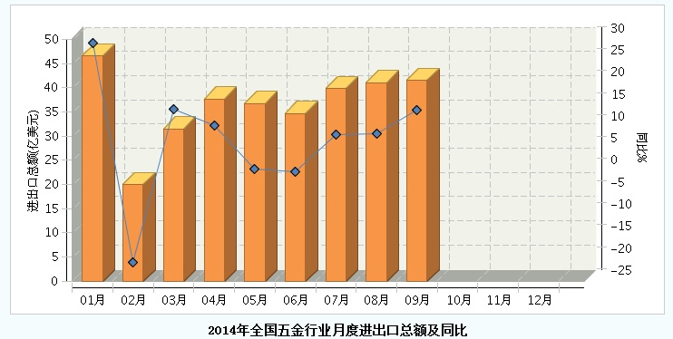 根据海关统计数据,2014年1月~9月,我国五金制品行业累计完成进出口总额329.45亿美元,同比增长7.93%,增速较上半年增速提高了1.28个百分点。其中,全行业完成出口额309.12亿美元,占全 出口总额的6.88%,位居第六位;完成进口额20.32亿美元,占全轻工进口总额的1.77%,位居第十六位。1月~9月五金全行业累计实现对外贸易顺差288.8亿美元,比上半年顺差增加了210.4亿美元。