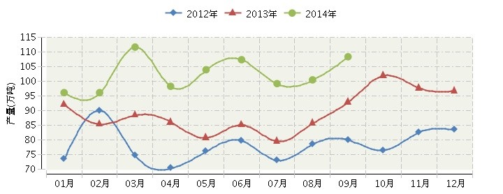 2014年全国合成洗涤剂连续三年月度产量对比