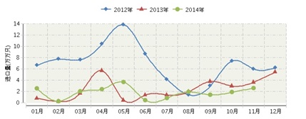 2014年全国白炽灯泡行业连续三年月度进口量对比