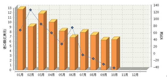 根据国家海关公布数据,2014年1~10月,全国食品行业累计进口额86.40亿美元,同比增长30.52%。其中: 10月份进口额6.36亿美元,同比下降34.2%。2014年月度数据走势及同比增长情况如下图所示。