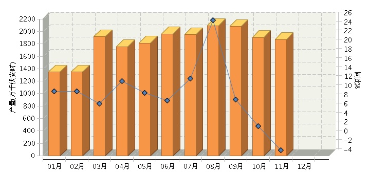根据国家统计局公布数据,2014年1~11月全国铅酸蓄电池行业累计完成产量同比增长6.74%。其中:11月份完成产量同比增长-2.76%。2014年全国铅酸蓄电池行业月度产量及同比如下图所示。