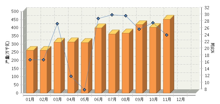 根据国家统计局公布数据,2014年1~11月,全国太阳能电池行业累计完成产量同比增长27.71%。其中:11月份完成产量同比增长25.04%。2014年全国太阳能电池行业月度产量及同比如下图所示。