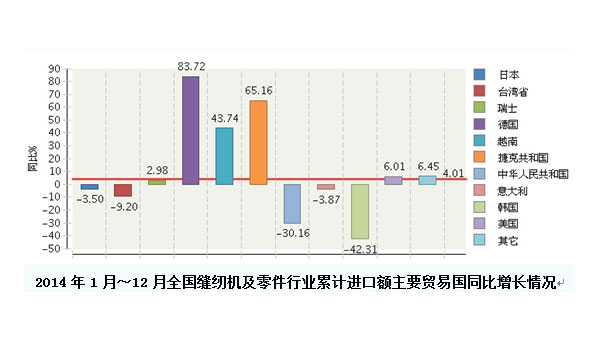 2014年1~12月,全国缝纫机及零件行业完成累计进口额2.63亿美元,同比增长4.01%。比重主要集中在日本、台湾省、瑞士、德国、越南、捷克共和国、中华人民共和国、意大利、韩国、美国地区。