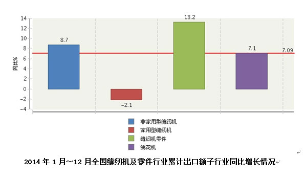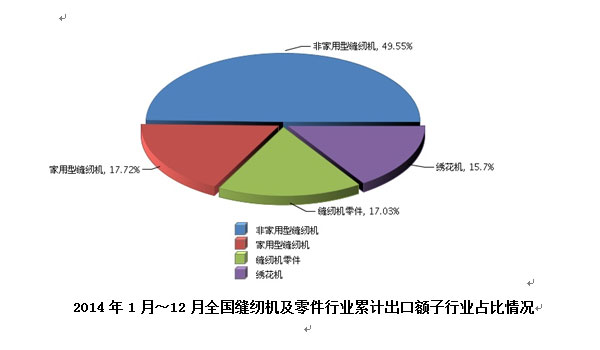 2014年1~12月,全国缝纫机及零件行业完成累计出口额21.61亿美元,同比增长7.09%。其中,非家用型缝纫机完成累计出口额10.71亿美元(占49.55%),同比增长8.72%;家用型缝纫机完成累计出口额3.83亿美元(占17.72%),同比增长-2.13%;缝纫机零件完成累计出口额3.68亿美元(占17.03%),同比增长13.22%;绣花机完成累计出口额3.39亿美元(占15.7%),同比增长7.08%。