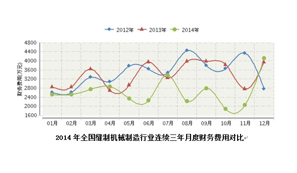 2014年1~12月,全国缝制机械制造行业累计完成财务费用31,718.30万元,同比增长-25.08%。其中:1月份完成财务费用2520.25万元,同比增长-12.69%;2月份完成财务费用2520.25万元,同比增长-12.69%;3月份完成财务费用2753.3万元,同比增长-23.76%;4月份完成财务费用2869万元,同比增长12.22%;5月份完成财务费用2340.5万元,同比增长-20.52%;6月份完成财务费用2259.3万元,同比增长-51.69%;7月份完成财务费用3372.1万元,同比增长-7.27%;8月份完成财务费用2226.7万元,同比增长-47.04%;9月份完成财务费用2791.5万元,同比增长-31.48%;10月份完成财务费用1885.2万元,同比增长-55.91%;11月份完成财务费用2058.1万元,同比增长-32.56%;12月份完成财务费用4122.1万元,同比增长16.73%。