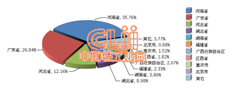 据国家统计局数据显示,2014年1~12月卫生陶瓷产量前三位的地区依然是河南、广东、河北。其中河南产量居全国首位,累计生产0.70亿件(同比增长27.47%),占全国卫生陶瓷产量(下同)的35.76%,与上年同期相比,占比提高了7.93个百分点;广东累计0.53亿件(同比下降3.24%),占26.84%;河北累计0.24亿件(同比下降5.35%),占12.16%。