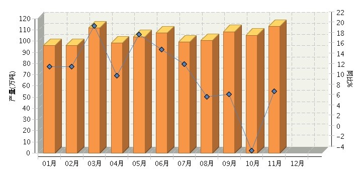 根据国家统计局公布数据,2014年1月~11月,全国合成洗涤剂行业累计完成产量1,105.91万吨,同比增长11.13%。其中:11月份完成产量113.07万吨,同比增长7.96%。2014年月度数据走势及同比增长情况如下图所示。