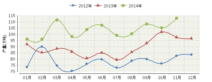 2014年全国合成洗涤剂行业连续三年月度产量对比