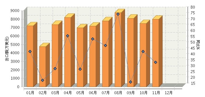 根据海关总署发布数据,2014年1~11月,全国香精香料行业累计完成出口额81,706.99万美元,同比增长41.79%。其中:11月份完成出口额7978.6万美元,同比增长35.8%。2014年全国香精香料行业月度出口额及同比增长趋势如下图所示。