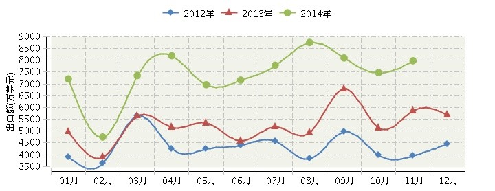 2014年全国香精香料行业连续三年月度出口额对比