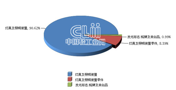 2015年1~3月,全国照明灯具行业完成累计出口额73.33亿美元,同比增长29.40%。其中,灯具及照明装置完成累计出口额66.45亿美元(占90.62%),同比增长29.7%;灯具及照明装置零件完成累计出口额6.15亿美元(占8.39%),同比增长27.49%;发光标志.铭牌及类似品完成累计出口额0.73亿美元(占0.99%),同比增长18.63%。